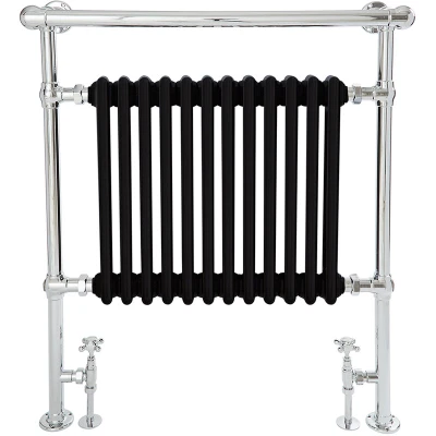 General description Keep your towels tidy and perfectly warmed with the traditional floorstanding Milano Elizabeth heated towel rail featuring a cast iron style insert and an overhanging rail. This towel rail is made from premium quality steel and is accentuated by a timeless chrome and black powder-coated finish. With an impressive heat output, your towels will always feel cozy and ready for use. Technical specifications Dimensions: 930mm x 790mm x 230mm Heat output: 2569 BTUs / 753 Watts (T50); 1364 BTUs / 400 Watts (T30) Construction material: Steel Finish: Chrome and black powder-coated Tested and certified to BS EN 442 standard ISO9001:2015 registered manufacturer Other information Includes blanking and bleed plug plus fixings This product is covered for 10 years Please note: You will need radiator valves