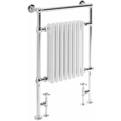 Ensure that your towels are always heated to perfection and ready to use with the traditionally designed floorstanding Milano Elizabeth dual fuel heated towel rail which boasts a classic look with a white cast iron style insert. Benefitting from premium quality steel construction and accentuated by a chrome finish the towel rail offers dual fuel functioning meaning that it can be run as part of a central heating system or electrically using the included 600W Rotfil heating element. Thanks to the impressive heat output you can be sure that your living space will enjoy a warm and inviting atmosphere. A pair of chrome angled radiator valves are included to complete the timeless aesthetic. - Chrome and white dual fuel floorstanding cast iron style heated towel rail - Steel construction with hard-wearing finish - Dual fuel design allows central heating or electric use - Generous heat output plus 600W heating element - Chrome angled valves plus blanking and bleeding plug - Includes the