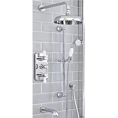 AmazonTraditional triple diverter thermostatic valve, wall-mounted 200mm round rainfall shower head, telephone-style hand shower riser rail kit with white ceramic handle and wall-mounted bath spout Lead-free solid brass construction with chrome finish and ceramic disc technology to prevent drips Thermostatic control and integral anti-scald technology for a safe shower White ceramic lever and crosshead handles with detailed indices (two outlets can be used simultaneously) Compatible with all types of plumbing system, Weight: 17.2181026622 pounds, Manufacturer: Milano