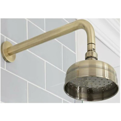 General description Enjoy a luxurious shower experience with the classic looking 155mm Milano Elizabeth round fixed shower head and wall-mounted arm. The traditional design features premium quality solid brass construction, accentuated by a moisture blemish resistant brushed gold finish, providing soothing rainfall effect coverage to leave you feeling relaxed. The matching shower arm allows for perfect positioning of the shower head to maximize the refreshing feel of your shower. Technical specifications Material: Solid brass Finish: Brushed gold Shower head diameter: 155mm Shower head height: 105mm Inlet connection: 1/2” Minimum recommended pressure: 1.0 bar Compatibility and accessories Compatible with domestic and commercial plumbing systems Includes a wall-mounted arm for perfect positioning Other information This product is covered for 10 years The hand-finished nature of this item means that the color and tone can vary slightly between products with the same finish, creating a
