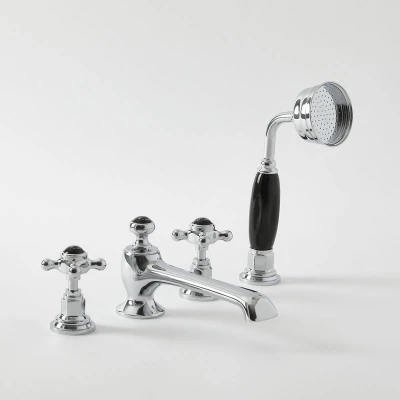 General description The traditional Milano Elizabeth 4 tap-hole crosshead bath shower mixer tap creates a classic look in your bathroom while enhancing your bathing experience. Finished in chrome and accentuated by black ceramic indices, the tap features crosshead handles for simple independent control of hot and cold water. The pull-out hand shower adds an extra touch of luxury to your bathtime, leaving you feeling relaxed. Technical specifications Material: Premium quality lead-free solid brass Finish: Chrome and black Design: Traditional with crosshead handles Hot water: Clockwise turn Cold water: Anticlockwise turn Technology: Integral ceramic disc for drip-free use Recommended minimum pressure: 1.0 bar Warranty: 10 years Compatibility and accessories Compatible with all types of plumbing systems Includes a telephone style hand shower and hose Waste required (not included)