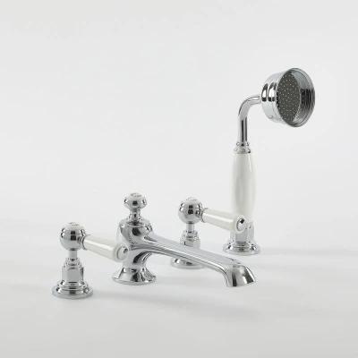 General description The traditional Milano Elizabeth 4 tap-hole crosshead bath shower mixer tap creates a classic look in your bathroom while enhancing your bathing experience. Finished in chrome and accentuated by white ceramic indices, the tap features crosshead handles for simple independent control of hot and cold water. The pull-out hand shower allows for a more relaxing bathtime experience, and the solid brass construction ensures long-lasting durability. Technical specifications Premium quality lead-free solid brass construction Chrome and white finish Traditional design White ceramic lever handles with detailed indices Clockwise turn for hot water and anticlockwise for cold Integral ceramic disc technology for drip-free use Recommended minimum pressure: 1.0 bar Covered for 10 years Compatibility and accessories Includes a telephone style hand shower and hose Diverter to switch between hand shower and tap Compatible with all types of plumbing systems Other information You will