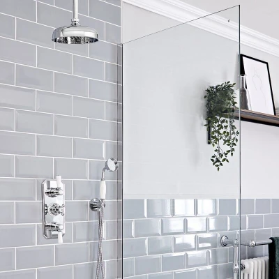 General description Create an eye-catching classical style statement in your bathroom whilst enjoying a truly luxurious showering experience with the Milano Elizabeth two outlet shower system. This system includes a triple thermostatic shower valve, a 205mm round shower head with a ceiling-mounted arm, and a hand shower kit. Accentuated by a sleek chrome finish with white ceramic accents for a traditional feel, the premium quality solid brass shower system delivers refreshing rainfall effect coverage from the shower head and soothing water flow from the hand shower. Technical specifications Solid brass construction with chrome finish 205mm round shower head Hand shower with 1.75m hose Minimum recommended pressure: 1.0 bar Incorporates ceramic disc technology to prevent leaks and drips Usage Multi-function shower can operate both outlets simultaneously or separately Ergonomic lever and crosshead handles for precise adjustments to temperature and flow Utilises anti-scald technology to