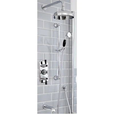 Milano Elizabeth Traditional Triple Diverter Thermostatic Mixer Shower Valve with 200mm Round Rainfall Head, Riser Rail Slide Bar Kit and Wall Mounted Bath Spout Chrome Black