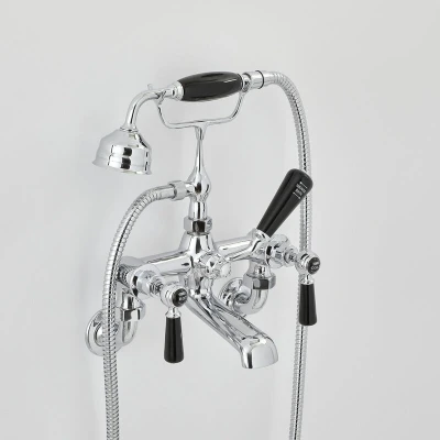 General description The wall-mounted Milano Elizabeth bath shower mixer tap exudes a classic style that will not only enhance the elegance of your bathroom but also provide a luxurious bathing experience. Accentuated by a smart chrome finish, this traditional tap features black ceramic lever handles with matching indices and an attractive hand shower with an ergonomic handle to elevate your bathtime. Technical specifications Material: Premium quality lead-free solid brass Finish: Chrome and black Design: Traditional Handles: Black ceramic lever handles with detailed indices Operation: Clockwise turn for hot water and anticlockwise for cold Technology: Integral ceramic disc technology for drip-free use Pressure: Recommended minimum pressure: 1.0 bar Warranty: Covered for 10 years Compatibility and accessories Includes a telephone style hand shower and hose Diverter to switch between hand shower and tap Compatible with all types of plumbing systems Other information Please note: You