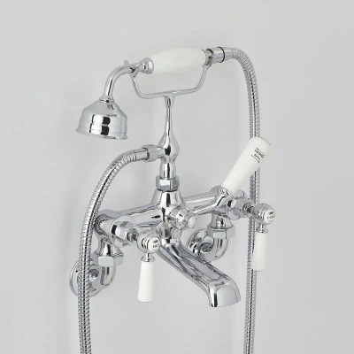 General description The wall-mounted Milano Elizabeth bath shower mixer tap exudes a classic style that will not only enhance the elegance of your bathroom but also provide a luxurious bathing experience. Accentuated by a smart chrome finish, this traditional tap features white ceramic lever handles with matching indices and an attractive hand shower with an ergonomic handle for added comfort during use. Technical specifications Material: Premium quality lead-free solid brass Finish: Chrome and white Design: Traditional Handles: White ceramic lever handles with detailed indices Operation: Clockwise turn for hot water and anticlockwise for cold Technology: Integral ceramic disc technology for drip-free use Included: Telephone style hand shower and hose Diverter: To switch between hand shower and tap Recommended minimum pressure: 1.0 bar Warranty: 10 years Compatibility and accessories Compatible with all types of plumbing systems Note: A waste is required (not included)