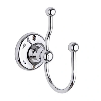 AmazonTraditional wall-mounted curved double bathroom robe hook and fixing kit Solid brass construction with chrome finish Dimensions: 54mm x 111.5mm x 104mm Allows you to neatly hang your bathrobes or towels ready for use Includes all the fixings you need for installation