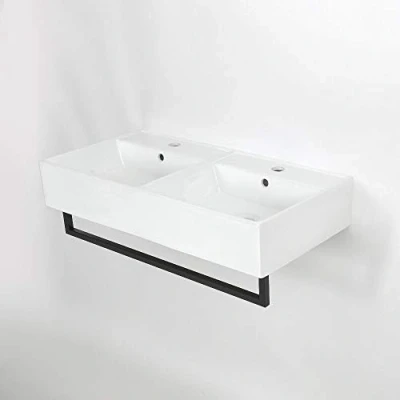 AmazonModern rectangular wall hung bathroom double basin with one tap-hole per basin and black towel rail Ceramic and stainless steel construction Dimensions: 820mm x 420mm x 245mm Each basin is fitted with an overflow You will need 2x mono basin taps, 2x slotted or universal wastes and 2x bottle traps, Weight: 53.9471155114 pounds, Manufacturer: Milano