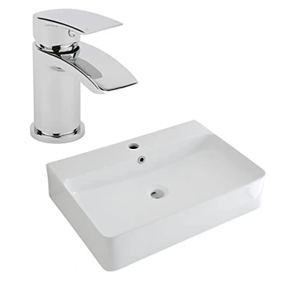 Milano Farington Modern White Ceramic Rectangular Countertop Bathroom Basin Sink and Mono Mixer Tap 600mm x 420mm