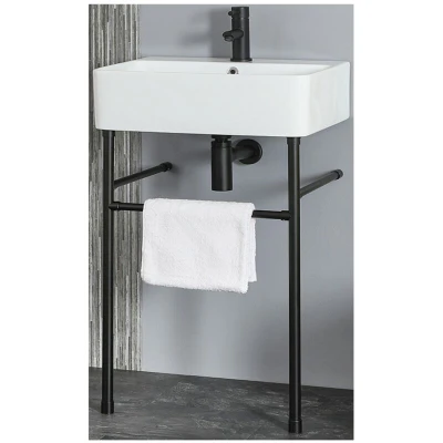General description The Milano Farington 600mm x 420mm basin and washstand is an ideal choice for adding a contemporary touch to your bathroom, making it stand out. The basin is constructed from premium quality ceramic, featuring a hard-wearing and easy-to-clean finish, and is fitted with a single tap-hole for use with a mono basin tap. The accompanying washstand is made from durable stainless steel with a modern black finish and includes an integral towel rail for convenience. Technical specifications Dimensions: 600mm x 420mm x 865mm Material: Ceramic and stainless steel Single tap-hole for mono basin tap Basin certified to EN14688 10-year warranty Compatibility and accessories Requires a mono basin tap Requires slotted or universal waste and bottle trap Installation Fitting kit included for easy installation Washstand requires some assembly prior to installation May need shortening for proper fit