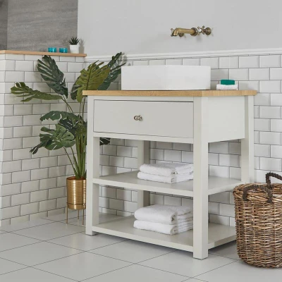 Give your bathroom a touch of classic style and practical storage space with the freestanding Milano Henley vanity unit and square countertop basin. The traditional engineered wood design which features an antique white body and oak effect countertop includes a premium quality ceramic 360mm square countertop basin with an easy to clean glaze that allows for use with a wall-mounted or high-rise tap. Storage for your bathroom essentials is provided courtesy of the integral soft close drawer and two open shelves to help maintain a neat look in your bathroom. - FSC engineered wood construction with antique white (RAL 9001) and oak effect finish - Freestanding design to create a traditional look - Includes a soft close drawer and two open shelves - Ceramic basin with hard-wearing white coating - Assembly required before installation - This product is covered for 5 years - Dimensions: 840mm x 470mm x 905mm Please note: You will need a wall-mounted or high-rise basin tap unslotted waste and