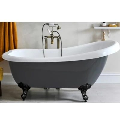 General description Create a classic and elegant look in your bathroom with the traditional design of the Milano Hest freestanding slipper bath, accentuated by a stunning stone grey finish and a set of attractive black feet. Offering space and comfort for a luxurious and relaxing bathing experience while supporting your neck and shoulders, this bath is made from premium quality acrylic with a hard-wearing coating that helps resist stains and scuffs. The bath is not fitted with any tap-holes, making it the perfect choice to pair with a wall-mounted or freestanding tap. Technical specifications Material: Premium quality 18mm thick acrylic Finish: Stone grey (RAL 7011) Dimensions: 1710mm x 740mm x 785mm Capacity: 192 litres Weight: Not specified Compatibility and accessories Compatible with freestanding or wall-mounted taps Requires a freestanding or wall-mounted mixer tap Exposed bath waste and a shallow seal trap are needed Other information Finished in a hard-wearing coating for easy