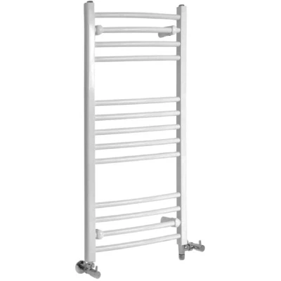 Ensure that your towels always feel perfectly warmed ready for use with the modern Milano Ive dual fuel curved bar heated towel rail. Accentuated by an attractive white powder coated finish the towel rail is made from premium quality steel and provides space to keep your towels hung neatly and your bathroom looking tidy. Dual fuel functionality means that the towel rail can be used within a central heating system or electrically using the 400W Rotfil heating element. A pair of chrome angled valves are included to complement the stylish aesthetic. - White dual fuel curved bar heated towel rail - Steel construction with hard-wearing finish - Dual fuel to allow central heating or electric use - Generous heat output plus 400W heating element - Supplied with a pair of chrome angled valves - Includes the fixings needed for installation - Certified and tested to EN442 standard - ISO9001:2015 registered manufacturer - This product is covered for 10 years - Dimensions: 1000mm x 498mm x 44mm