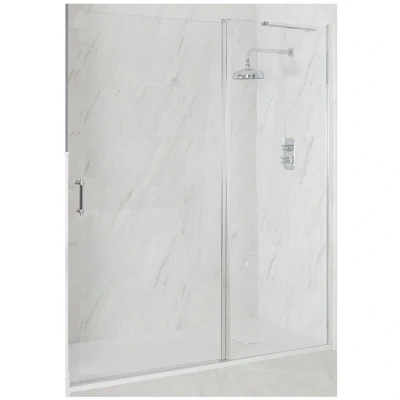Milano Langley Chrome Wet Room Walk In Hinged Door Frameless Shower Enclosure with White Slate Effect Tray and Fast Flow Waste 1100mm x 700mm