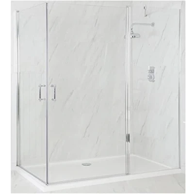 AmazonToughened glass and aluminium construction Includes 800mm and 760mm hinged shower doors, 700mm fixed inline panel and 1500mm x 760mm white tray Hard-wearing polished aluminium finish Hinged doors allow easy entry to the enclosure Acrylic capped polymer resin tray with fast flow waste Height of 1950mm to catch more splashes, Weight: 0.551155655 pounds, Manufacturer: Milano