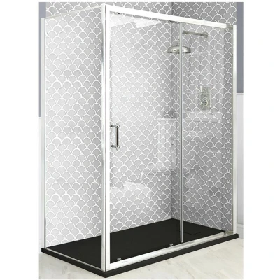 General description The Milano Langley corner shower enclosure features a sliding door, side panel, and a graphite slate effect tray, making it an ideal choice for creating a classic look in your bathroom. The enclosure is designed with a sleek polished aluminium profile and a traditionally styled chrome brass handle, ensuring both functionality and aesthetic appeal. Technical specifications Shower tray dimensions: 1400mm x 800mm x 30mm Panel height: 1850mm Glass thickness: 6mm toughened safety glass Door entry width: 597mm Other information Magnetic seal for secure and watertight closure Double rollers at the top and bottom for smooth operation Textured graphite slate effect shower tray with fast flow waste for effective drainage Certified to meet EN14428 and EN12150-2 quality standards This product is covered for 10 years