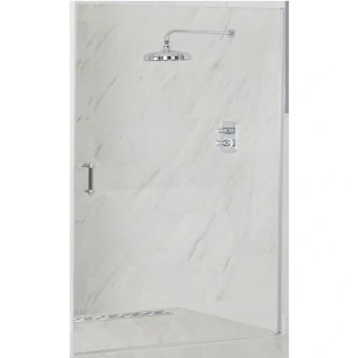 General description Enhance the classic look of your bathroom with the attractive Milano Langley hinged frameless shower door. Accentuated by a stunning polished aluminium profile and a traditional brass handle, the door is made from premium quality 6mm toughened safety glass. Technical specifications Material: 6mm toughened safety glass Height: 1950mm Entry width: 717mm Construction: Polished aluminium profile Standards: Manufactured to EN14428 and EN12150-2 standards Compatibility and accessories Compatible with Milano shower trays and drains Includes an 800mm hinged shower door Other information This product is covered for 10 years