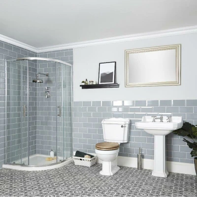 General description The Milano Legend traditional shower suite includes an 800mm quadrant shower enclosure, a close coupled toilet, and a full pedestal basin, providing a classic style for your bathroom. Technical specifications Shower enclosure dimensions: 800mm x 800mm x 1850mm Basin dimensions: 590mm x 495mm x 920mm Toilet dimensions: 485mm x 740mm x 860mm Shower enclosure features 6mm toughened safety glass Profile adjustment for the enclosure: 770-790mm Door entry width: 430mm Shower enclosure radius: 550mm Basin certified to EN14688 standard Compatibility and accessories Requires taps Requires a slotted or universal waste Requires a pan connector Installation Includes a pan fixing kit to aid installation Usage Designed for traditional bathroom settings Other information Covered for 10 years