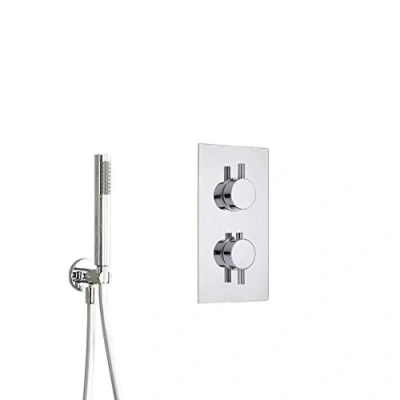AmazonTwin thermostatic shower valve with round pencil hand shower, 1.75m hose, outlet elbow and wall bracket Solid brass and ABS construction with chrome finish and ceramic disc technology to prevent drips Thermostatic control and integral anti-scald technology for a safe shower Round handles for easy adjustment of the water temperature and flow to the outlet Compatible with all types of plumbing system, Weight: 7.3413933246 Pounds, Manufacturer: Milano