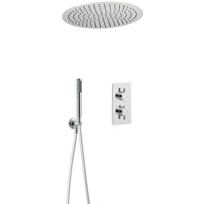 Milano Mirage 2 Outlet Twin Diverter Thermostatic Mixer Shower Valve with Ceiling Mounted 400mm Round Recessed Rainfall Head and Hand