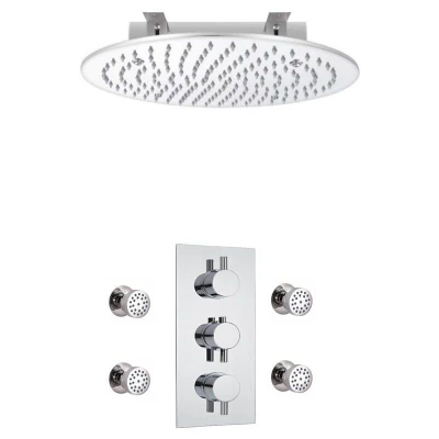 Milano Mirage Modern 2 Outlet Triple Thermostatic Mixer Shower Valve with 400mm Ceiling Mounted Round Recessed Rainfall Head and Body Jets