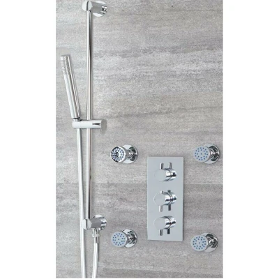 Milano Mirage Modern 2 Outlet Triple Thermostatic Mixer Shower Valve with Hand Handset Slide Rail Bar Kit and Four Body Jets Chrome