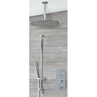 General description Enjoy a spa-like shower with the chrome Milano Mirage two outlet shower system, featuring a triple thermostatic shower valve, a 300mm round shower head with a ceiling arm, and a slide rail kit. This modern shower system is designed to complement any contemporary bathroom. Technical specifications Shower head diameter: 300mm Minimum recommended pressure: 1.0 bar Material: Solid brass valve, anti-corrosive stainless steel shower head Hose length: 1.75m Compatibility and accessories Compatible with all types of plumbing systems Includes slide rail kit with ABS hand shower, outlet elbow, and slide rail Installation Ceiling-mounted shower head with arm Slide rail kit for adjustable hand shower positioning Usage Thermostatic control for easy and precise adjustment of temperature and flow Can operate both outlets simultaneously or separately Ergonomic round handles for simple and intuitive use Silicone nozzles for easy cleaning and removal of limescale Other information
