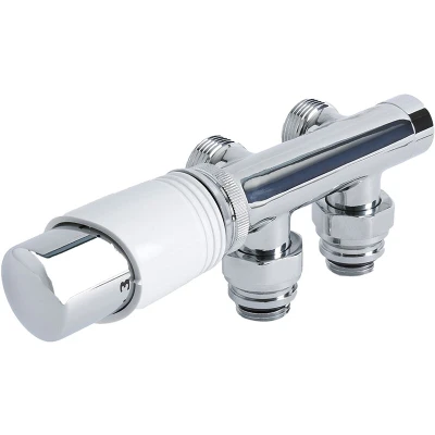 General description Designed for use with a middle connection radiator, the Milano 3/4" male thread angled H-block valve and thermostatic radiator valve add a stylish finishing touch. The white TRV allows for thermostatic control of heat output, enabling you to create the desired warmth in your living space. With premium quality solid brass construction and a sleek chrome finish, this valve seamlessly blends with contemporary decor. Technical specifications Type: 3/4" male thread H-block angled valve and thermostatic radiator valve Material: Solid brass with chrome and white finish Inlet: 3/4" male thread Adapters: Includes a pair of 15mm copper adapters Other information This product is covered for 5 years