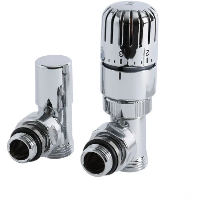 General description Enhance the stylish and contemporary look of your radiator or heated towel rail with this pair of Milano angled thermostatic valves. These modern valves are designed to provide both functionality and aesthetic appeal. Technical specifications Material: Solid brass and ABS Finish: Chrome Compatibility: Suitable for 15mm copper pipes Includes: Eurocone adapter for use with metal-plastic, polymer, thin-walled copper, and stainless steel fittings Warranty: Covered for 5 years Other information Supplied as a pair of valves