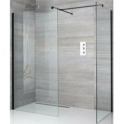General description Add a touch of style to your bathroom with the Milano Nero corner wet room shower enclosure, which consists of two 800mm wet room screens, a black profile, and two support arms with a T-piece. This modern enclosure features a reversible design, allowing for an entry width of up to 1000mm to suit your needs. The premium quality 8mm toughened safety glass construction and a height of 1950mm help to catch more splashes from the shower. Technical specifications Black corner wet room shower enclosure 8mm toughened safety glass Aluminium construction Height: 1950mm Entry width: up to 1000mm Support arms: 1000mm (can be cut to desired size) Manufactured to meet EN14428 standard Covered for 10 years