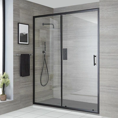 General description Create a stylish shower enclosure in the recess of your bathroom with the reversible Milano Nero shower enclosure, which includes a sliding door and light grey slate effect tray. This enclosure features a contemporary design that enhances your bathroom's aesthetic while providing functionality. Technical specifications Shower enclosure dimensions: 1400mm x 900mm Shower tray dimensions: 1400mm x 900mm x 30mm Panel height: 1950mm Door entry width: 597mm Glass thickness: 6mm Other information Made from premium quality toughened safety glass Matte black aluminium profile Double rollers for smooth door operation Magnetic seal for watertight closure Reversible design for left or right hand entry Textured finish on shower tray for a natural feel Fast flow waste included for efficient drainage Covered for 10 years Certified to meet EN14428 and EN12150-2 quality standards