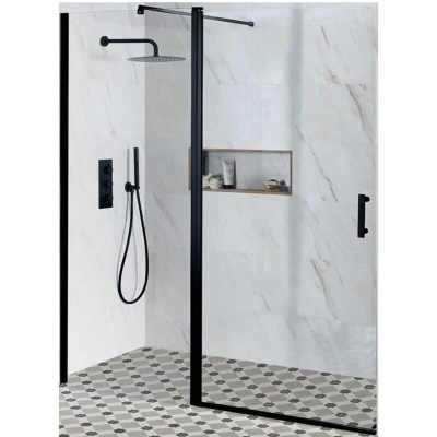 General description Accentuate the stylish look of your bathroom with the Milano Nero hinged frameless shower door and fixed inline panel. This minimalist design features a matte black aluminium profile that adds a contemporary touch while ensuring strength and durability. Technical specifications Material: 6mm toughened safety glass Profile: Matte black aluminium Door height: 1950mm Dimensions: 1300mm x 1950mm Hinged door width: 900mm Fixed panel width: 400mm Door entry width: 817mm Compatibility and accessories Compatible with a shower tray or wet room drain Other information Certified to EN14428 and EN12150-2 standards This product is covered for 10 years