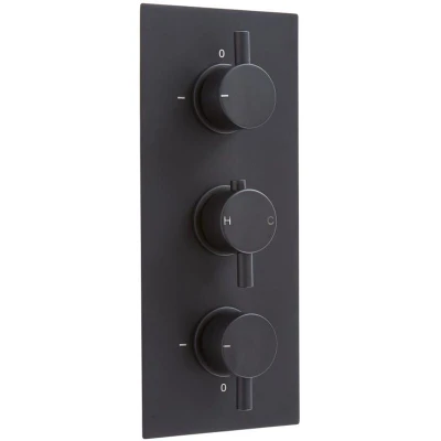 General description Adding modern style and a minimalist look to your bathroom, the black finished Milano Nero triple diverter thermostatic shower valve allows you to effortlessly control three shower outlets. With ergonomic round handles for ease of use, this premium quality solid brass shower valve features integrated anti-scald technology to prevent sudden changes in temperature, ensuring a safer showering experience. Thermostatic control allows for accurate adjustments, making your shower as refreshing and relaxing as you desire. Technical specifications Material: Solid brass Finish: Matte black powder coated Technology: Ceramic disc technology to prevent leaks and drips Minimum recommended pressure: 1.0 bar Features: Anti-scald technology, ergonomic round handles, diverter for three outlets Compatibility and accessories Compatible with all types of plumbing systems Other information This product is covered for 10 years