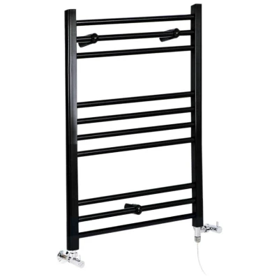 General description Ensure that your towels always feel perfectly warmed and ready for use with the modern Milano Nero dual fuel straight heated towel rail. Accentuated by an attractive black powder-coated finish, the towel rail is made from premium quality steel, providing space to keep your towels hung neatly and your bathroom looking tidy. Technical specifications Dimensions: 800mm x 500mm x 30mm Heat output: 1024 BTUs / 300 Watts (T50); 563 BTUs / 165 Watts (T30) Heating element: 400W Rotfil Construction material: Steel Finish: Black powder-coated Compatibility and accessories Includes a pair of black angled valves Includes the fixings needed for installation A cable cover is not included Installation The hard-wiring of the heating element should be carried out by a qualified electrician. Usage When the towel rail is used electrically, the heating element is self-regulating and does not require a thermostat. If temperature control is needed, an external thermostat will be