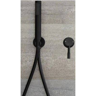 General description Featuring an intuitive lever handle to control the temperature and flow of water, the modern Milano Nero one outlet shower system adds a touch of contemporary style to your bathroom with its stunning black finish. The premium quality solid brass manual shower valve provides control over the ergonomic pencil hand shower, which features silicone nozzles that are easy to clean and deliver refreshing water coverage. Technical specifications Material: Solid brass Finish: Matte black powder coated Shower hose length: 1.75 m Minimum recommended pressure: 0.5 bar Compatibility and accessories Includes a brass pencil hand shower Includes a smooth hose Includes an outlet elbow and bracket for hanging the hand shower Other information This product is covered for 10 years