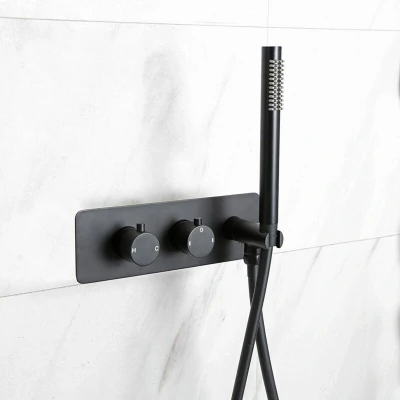 General description The Milano Nero twin diverter thermostatic valve adds contemporary style to your bathroom while providing a luxurious showering experience. Its matte black powder-coated finish and solid brass construction ensure durability and elegance. Technical specifications Material: Solid brass Finish: Matte black powder coated Minimum recommended pressure: 1.0 bar Hand shower hose length: 1.75m Anti-scald technology: Yes Ceramic disc technology: Yes Compatibility and accessories Compatible with all types of plumbing systems Includes ergonomic hand shower with silicone nozzles for easy cleaning Integral holder on the valve for hand shower storage Usage Intuitive round handles for temperature and flow adjustment Diverter to easily switch between two shower outlets Provides refreshing water coverage for a relaxing shower experience Other information This product is covered for 10 years