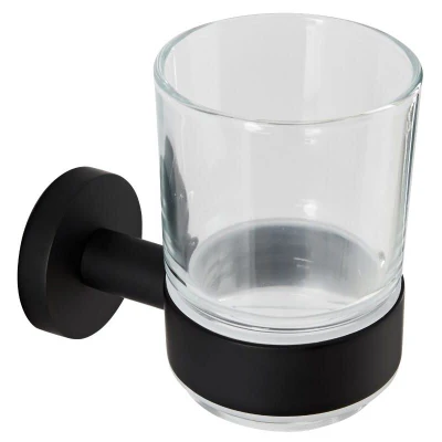 General description Add a stylish finishing touch to your contemporary bathroom with the attractive wall-mounted Milano Nero tumbler and holder. The modern matte black finish accentuates the premium quality solid brass construction, while the toughened glass tumbler ensures long-lasting durability. Technical specifications Material: Solid brass holder with matte black finish Tumbler: Toughened glass Dimensions: 66mm x 105mm x 99mm Installation Concealed wall fixings for a neat and minimalist look Wall mounted to maximize space around your basin Fixing kit included for easy installation Other information This product is covered for 2 years