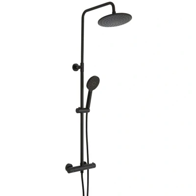 AmazonRound thermostatic bar shower valve with multifunction hand shower kit and 200mm round shower head with swivel joint for perfect positioning Solid brass and ABS construction with black powder coated finish and ceramic disc technology to prevent drips Thermostatic control and integral anti-scald technology for a safe shower Round handles for easy control of the water temperature and flow Compatible with all types of plumbing system, Weight: 0.551155655 Pounds, Manufacturer: Milano