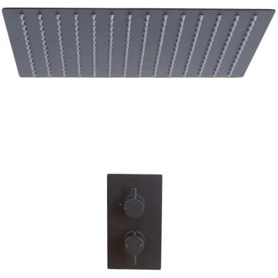 General description Give your bathroom a stylish and minimalist look with the contemporary Milano Nero one outlet shower system, which consists of a twin thermostatic shower valve and a recessed square shower head. The premium quality solid brass shower valve features intuitive round handles for precise control of temperature and water flow, incorporating anti-scald technology for a safe shower experience. The anti-corrosive stainless steel shower head provides refreshing rainfall effect coverage, ensuring a luxurious shower experience with a sleek and unobtrusive ceiling-mounted design. Finished in modern matte black, this shower system offers long-lasting durability. Technical specifications Shower head size: 400mm square Minimum recommended pressure: 1.0 bar Material: Solid brass valve and anti-corrosive stainless steel shower head Finish: Matte black powder coated Compatibility and accessories Compatible with all types of plumbing systems Supplied with a fixing kit for