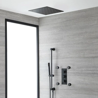 General description Enjoy a luxurious shower experience with the modern matte black Milano Nero three outlet shower system. This system includes a triple diverter thermostatic shower valve, a recessed ceiling-mounted shower head, body jets, and a riser rail with a brass hand shower, providing a spa-like experience in your own bathroom. Technical specifications Material: Solid brass valve Shower head size: 400mm square Hose length: 1.75m Minimum recommended pressure: 1.0 bar Finish: Matte black powder coated Installation Compatible with all types of plumbing systems Usage Can operate two of the three outlets simultaneously Features ergonomic round handles for intuitive use Intuitive diverter for easy switching between shower functions Silicone nozzles for easy cleaning and limescale removal Other information Covered for 10 years Anti-scald technology for safe use Swivel joint on body jets for adjustable spray direction Thermostatic control to prevent scalding and freezing Four solid