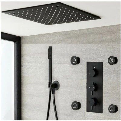 Milano Nero Thermostatic Mixer Valve Ceiling Mounted Recessed Head Hand Shower Body Jets Black