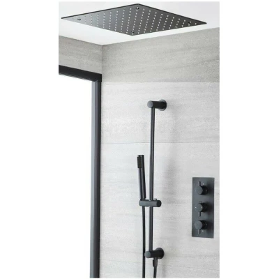 AmazonModern triple thermostatic shower valve with ceiling-mounted 400mm square recessed rainfall shower head and pencil hand shower riser rail kit Stainless steel and solid brass construction with black powder coated finish and ceramic disc technology to prevent drips Thermostatic control and integral anti-scald technology for a safe shower Round handles for easy adjustment of the water temperature and flow Compatible with all types of plumbing system, Weight: 20.4148054612 pounds, Manufacturer: Milano
