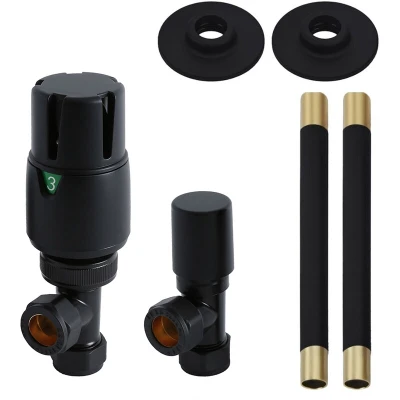 General description Add a stylish contemporary touch to enhance your modern radiator or heated towel rail with this pair of Milano angled thermostatic radiator valves and pipe connector kit. Benefitting from premium quality solid brass and ABS construction throughout with a black powder coated finish, the valves and pipe connectors have been designed to perfectly complement your heating appliance. Thanks to thermostatic control, you will be able to precisely adjust the temperature of an individual radiator for comfort and to help reduce energy consumption. Technical specifications Material: Solid brass and ABS Finish: Black powder coated Frost protection: Below 7°C Thread type: Standard 1/2" threads Compression fittings: 15mm Dimensions (valve): 62.31mm x 23.65mm x 132.9mm Dimensions (pipe connector): 15mm x 135mm Compatibility and accessories Supplied as a pair of valves and pipe connectors with flanges Other information This product is covered for 5 years