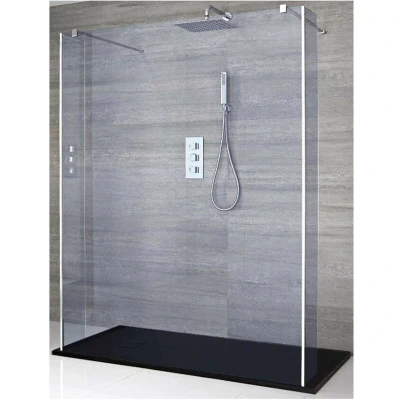 AmazonFrameless floating glass walk-in shower enclosure with smoked glass screen, return panels, support arms and textured graphite slate effect shower tray with fast flow waste 8mm toughened safety glass and aluminium construction with 1950mm height to catch more shower splashes Floating design and low profile tray allows for easy access to the enclosure from either side Textured slate effect tray with fast flow waste Enclosure consists of 1400mm smoked glass screen, 2x smoked return panels, 2x chrome support arms, 1400mm x 800mm graphite tray and waste, Weight: 0.551155655 pounds, Manufacturer: Milano