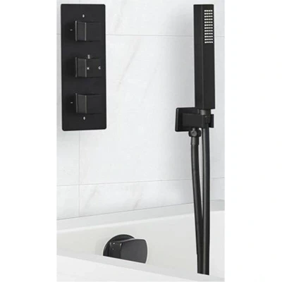 General description Enjoy a bath and shower that feels truly luxurious with the matte black Milano Preto two outlet system, which includes a triple thermostatic valve, hand shower kit, and an overflow bath filler. This modern system is designed to complement any contemporary decor while providing a premium bathing experience. Technical specifications Material: Solid brass valve Finish: Matte black powder coated Hand shower material: ABS Hose length: 1.75m Minimum recommended pressure: 1.0 bar Suitable for baths up to 15mm thick Includes: Overflow bath filler and waste Installation The bath filler is easily installed into the overflow of your bath and includes an integral waste. Usage Thermostatic control for accurate adjustment of temperature and flow of water. Can operate both outlets simultaneously or separately. Ergonomic square handles for simple and intuitive use. Silicone nozzles for easy cleaning and removal of limescale. Produces a refreshing water spray for a relaxing