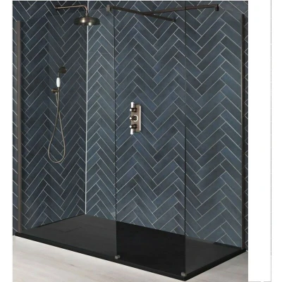 Enhance the stylish look of your bathroom with the modern Milano Rosso corner walk-in shower enclosure which comprises two glass screens and a textured graphite slate effect shower tray. Benefitting from 8mm toughened safety glass construction and a height of 1950mm to contain more splashes from your shower the screens are accentuated by contemporary premium quality matte bronze profiles and matching support arms. The reversible design allows you to install it perfectly in the corner of your bathroom to enable left or right entry. Completing the stylish and minimalist effect is the low profile shower tray which can be fitted on or level with the floor to enable easy access and includes a fast flow waste to efficiently drain away the water whilst showering. - Matte bronze corner walk-in shower enclosure - 8mm toughened safety glass and aluminium construction - Designed for installation in the corner of a bathroom - Reversible design to allow left or right hand entry - 1950mm high