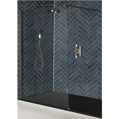 Add a touch of contemporary style to your bathroom with the Milano Rosso recessed walk-in shower enclosure which consists of a glass screen and textured graphite slate effect shower tray. Accentuated by a modern matte bronze profile and matching support arm the screen is made from premium quality 8mm toughened safety glass with a height of 1950mm to catch more shower splashes. Thanks to a reversible design the enclosure can be fitted into a recess in your bathroom to allow entry from the left or right. The low profile shower tray which includes a fast flow waste to efficiently clear the water when showering can be fitted on or level with the floor to enable easy access as well as giving a minimalist look. - Matte bronze walk-in shower enclosure - 8mm toughened safety glass and aluminium construction - Designed for installation in the recessed bathroom area - Reversible design to allow left or right hand entry - 1950mm high panels catch more shower splashes - Graphite slate effect