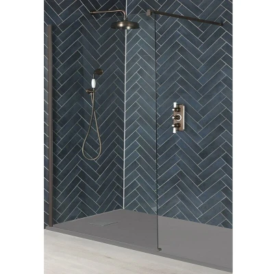 Add a touch of contemporary style to your bathroom with the Milano Rosso recessed walk-in shower enclosure which consists of a glass screen and textured light grey slate effect shower tray. Accentuated by a modern matte bronze profile and matching support arm the screen is made from premium quality 8mm toughened safety glass with a height of 1950mm to catch more shower splashes. Thanks to a reversible design the enclosure can be fitted into a recess in your bathroom to allow entry from the left or right. The low profile shower tray which includes a fast flow waste to efficiently clear the water when showering can be fitted on or level with the floor to enable easy access as well as giving a minimalist look. - Matte bronze walk-in shower enclosure - 8mm toughened safety glass and aluminium construction - Designed for installation in the recessed bathroom area - Reversible design to allow left or right hand entry - 1950mm high panels catch more shower splashes - Light grey slate effect