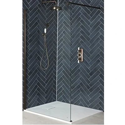 Accentuate the stylish look of your bathroom with the contemporary Milano Rosso walk-in shower enclosure which features a glass screen and textured white slate effect shower tray. Boasting a modern matte bronze profile and matching support arm the screen has a height of 1950mm to catch more shower splashes and is made from premium quality 8mm toughened safety glass. The reversible design means that it can be installed to allow entry from the left or right to perfectly suit your needs. Suitable for installing on or level with the floor the low profile shower tray offers a minimalist aesthetic as well as easy access and includes a fast flow waste to efficiently drain away the water whilst showering. - Matte bronze walk-in shower enclosure - 8mm toughened safety glass and aluminium construction - Reversible design to allow left or right hand entry - 1950mm high panels catch more shower splashes - White slate effect shower tray with fast flow waste - Manufactured to meet EN14428 standard