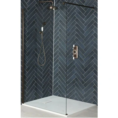 Accentuate the stylish look of your bathroom with the contemporary Milano Rosso walk-in shower enclosure which features a glass screen and textured white slate effect shower tray. Boasting a modern matte bronze profile and matching support arm the screen has a height of 1950mm to catch more shower splashes and is made from premium quality 8mm toughened safety glass. The reversible design means that it can be installed to allow entry from the left or right to perfectly suit your needs. Suitable for installing on or level with the floor the low profile shower tray offers a minimalist aesthetic as well as easy access and includes a fast flow waste to efficiently drain away the water whilst showering. - Matte bronze walk-in shower enclosure - 8mm toughened safety glass and aluminium construction - Reversible design to allow left or right hand entry - 1950mm high panels catch more shower splashes - White slate effect shower tray with fast flow waste - Manufactured to meet EN14428 standard